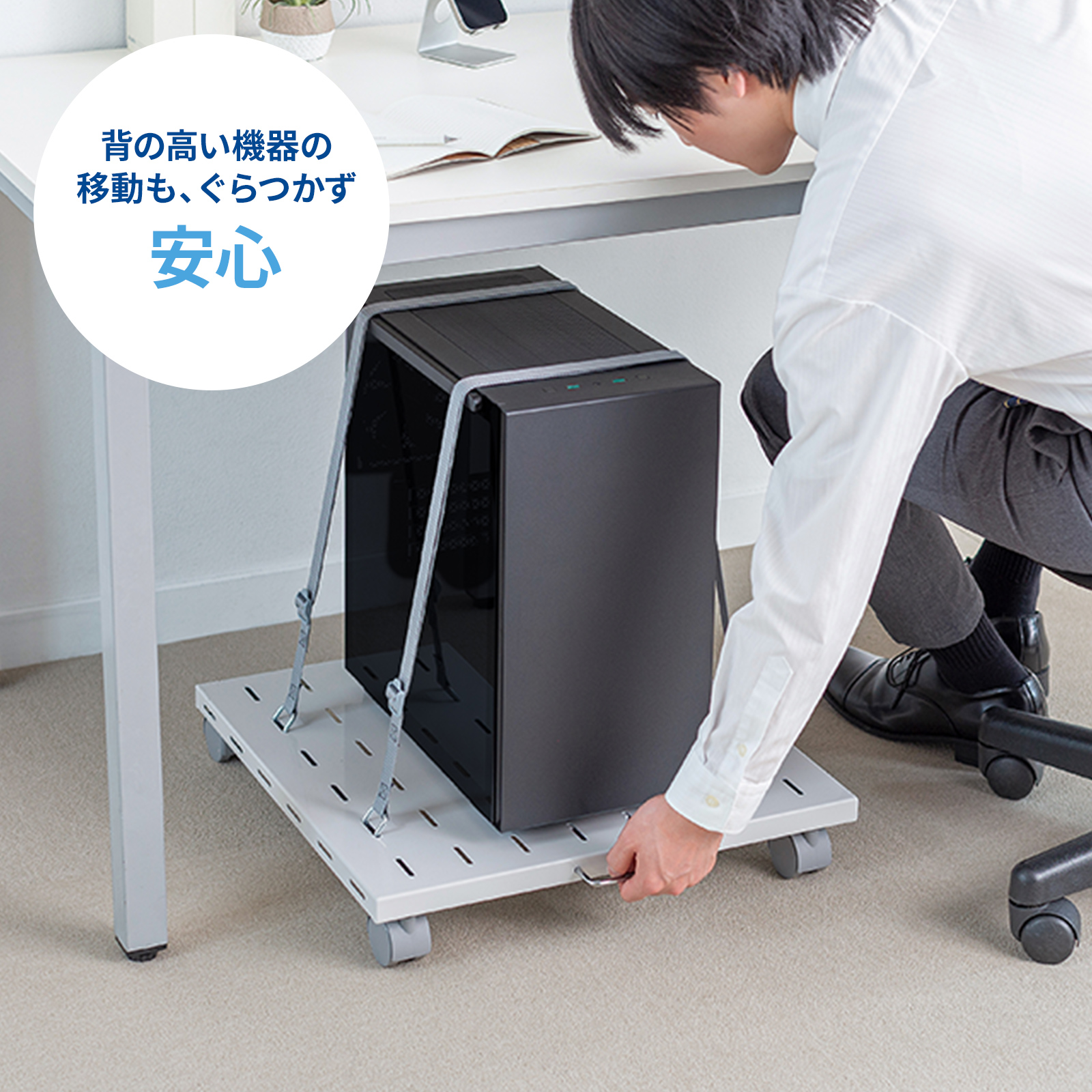機器をしっかり固定できるので、移動中の転倒やズレの心配がありません。