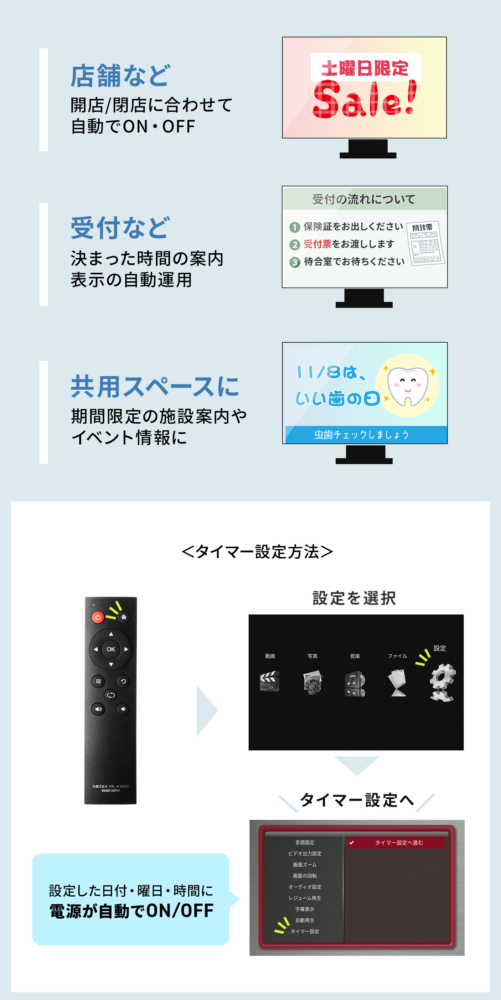 パソコン不要で、持ち運びや接続も簡単です。展示会での動画再生、店頭でのプロモーション、役所での案内など様々な場所でのデジタルサイネージに活用できます。