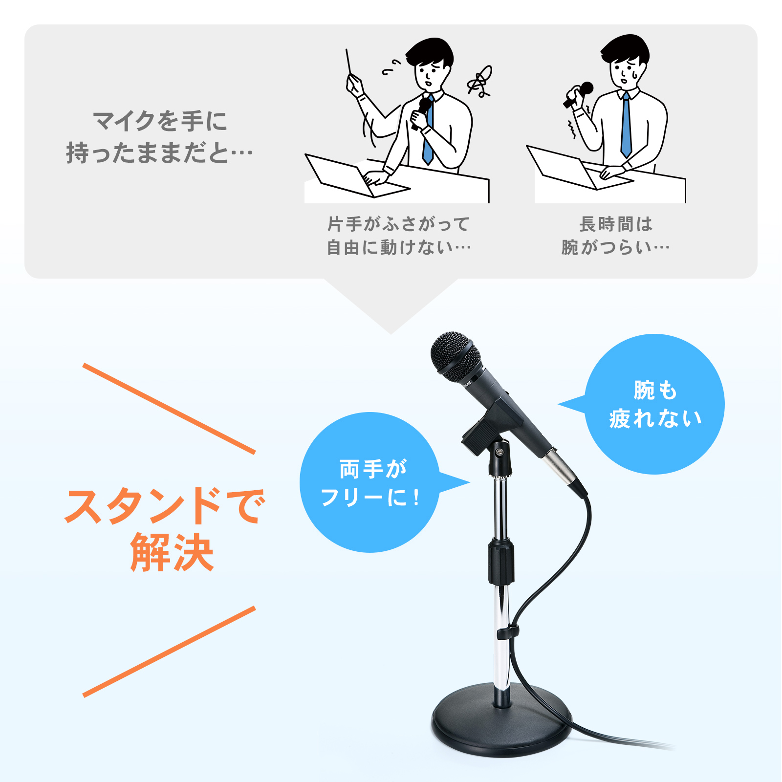 マイクスタンドがあれば、話しながら両手が使えるので、マイクを手に持ったままの不便さや腕のだるさを解消できます。