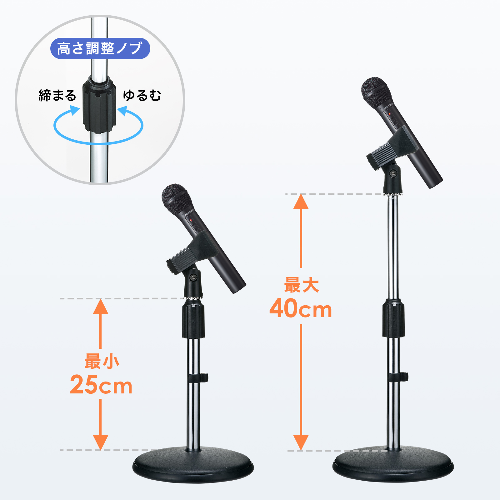 - 250~400mmまでの高さ調整が可能な卓上マイクスタンドです。