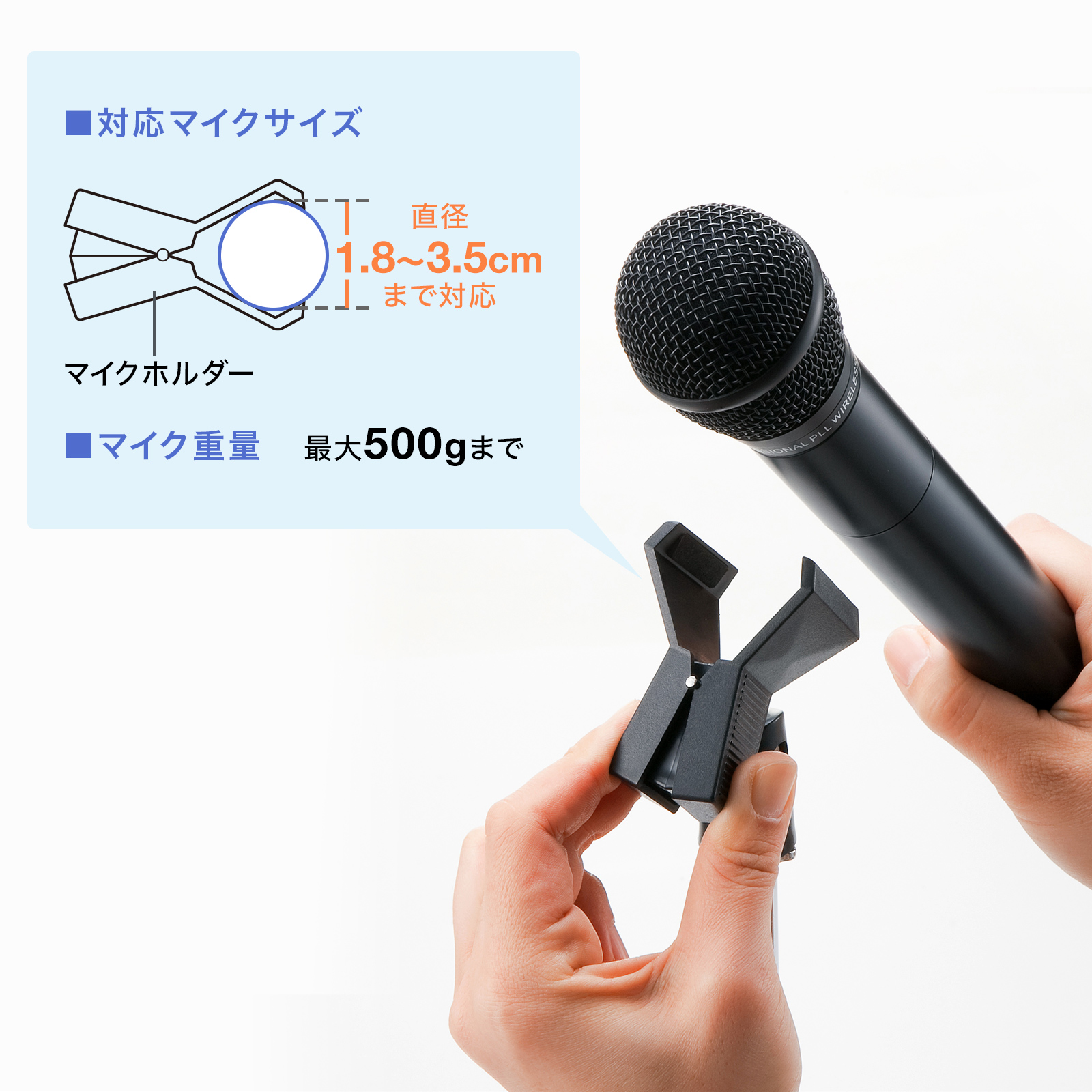 最大直径3.5cmまでの様々なマイクに対応しています。