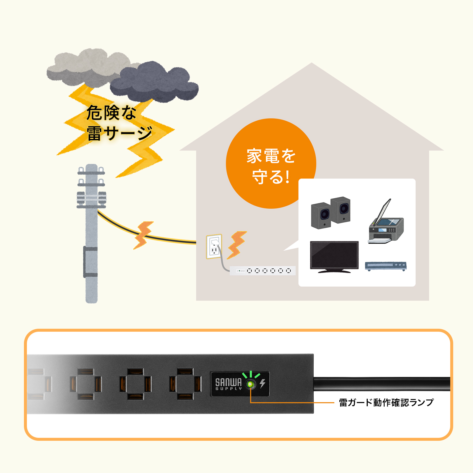 内蔵されたサージ吸収素子(バリスタ)が雷サージを吸収し、接続機器を守ります。