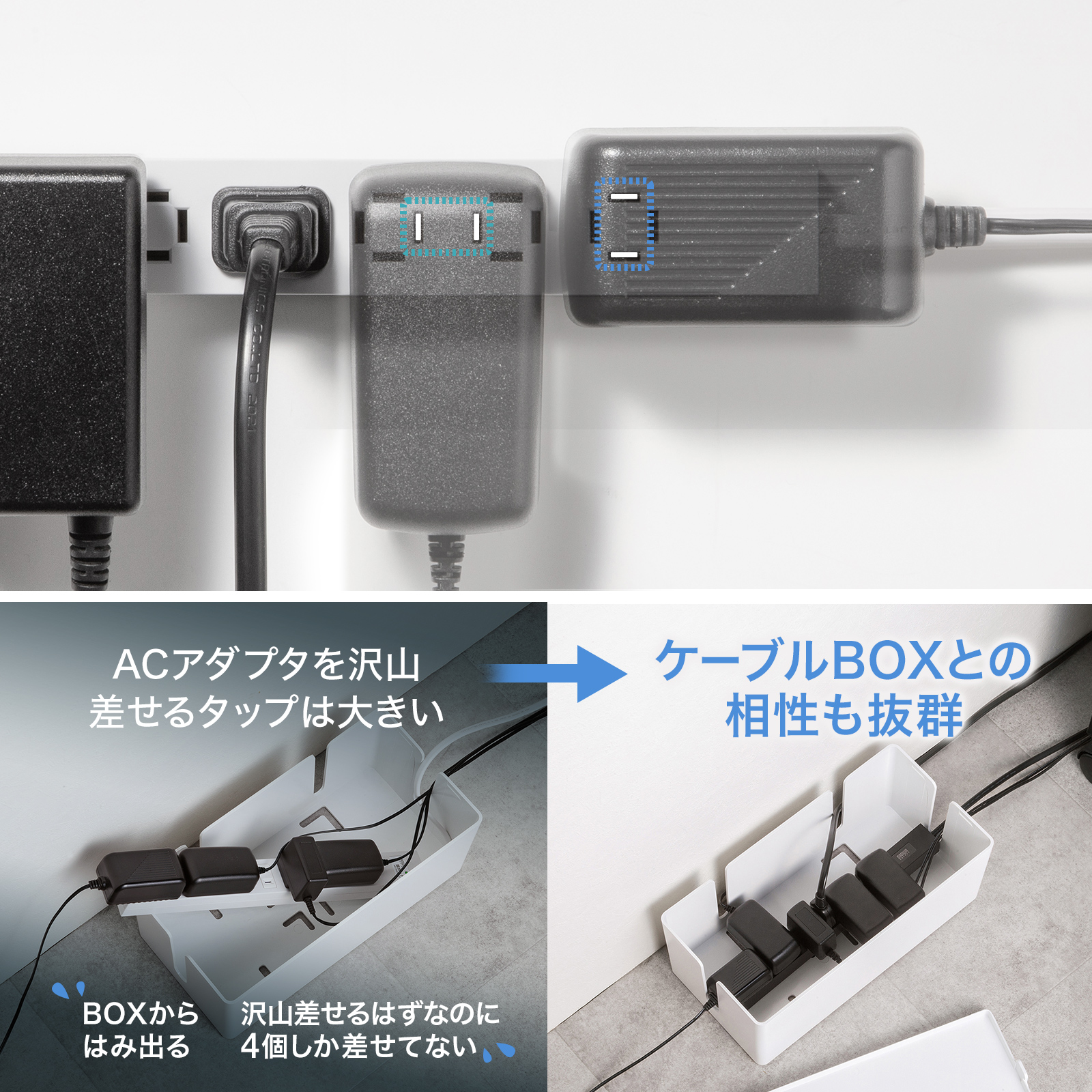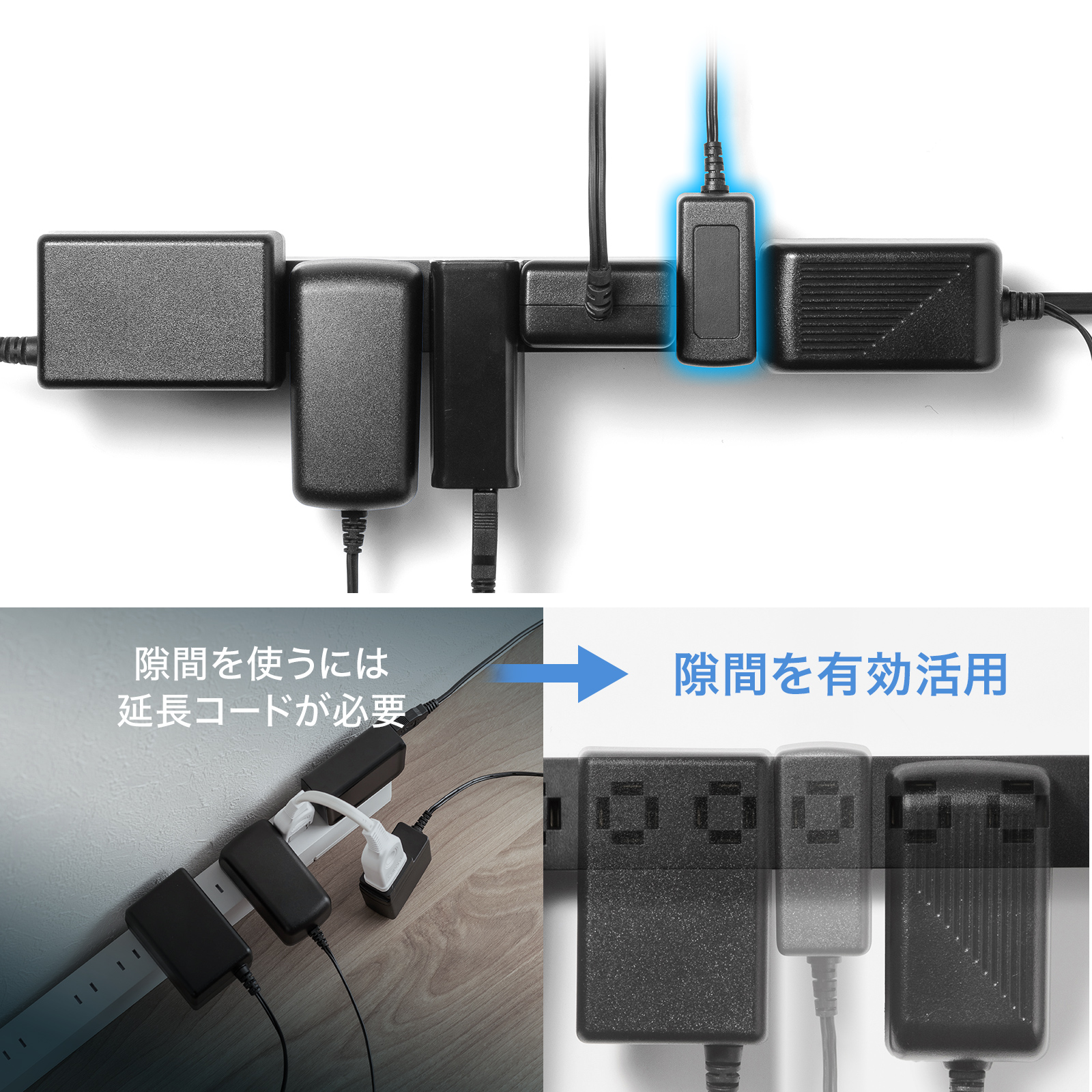 ACアダプタが多数必要な環境でも、スペースを無駄にせず効率的に差し込めます。
