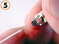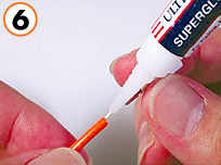 6)瞬間接着剤をファイバカバー部分につけコネクタにファイバを差し込みます。